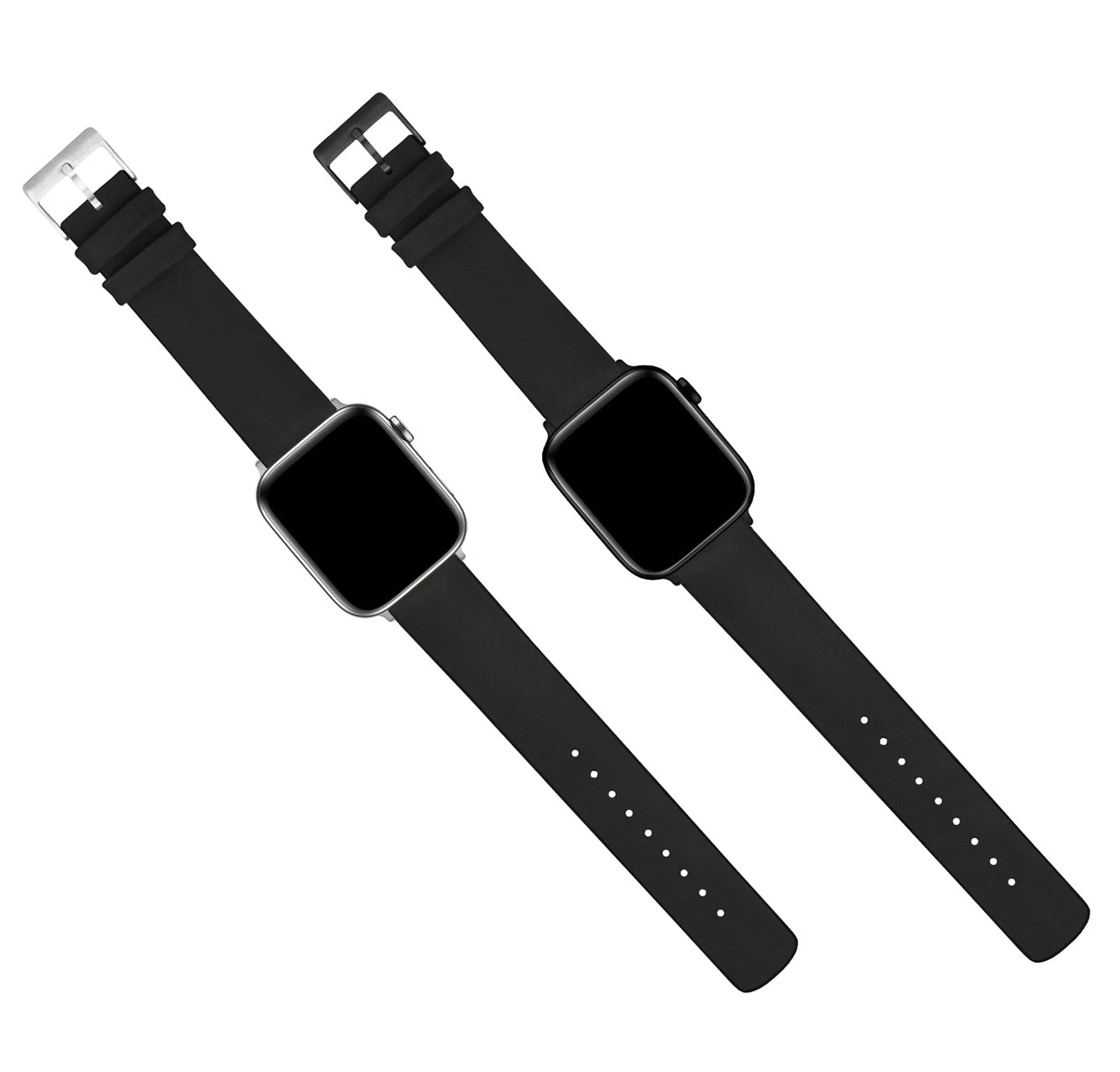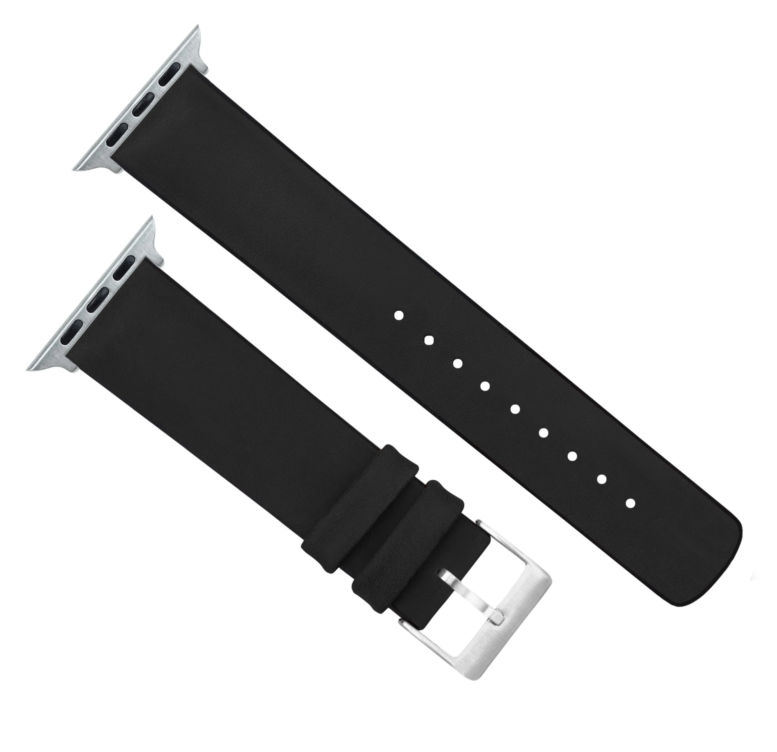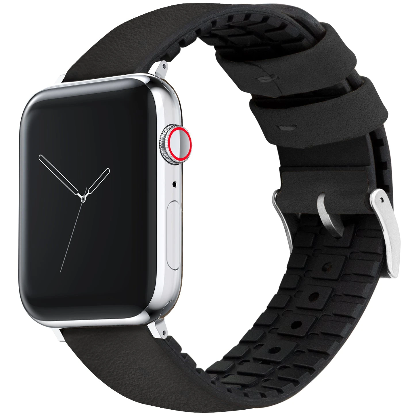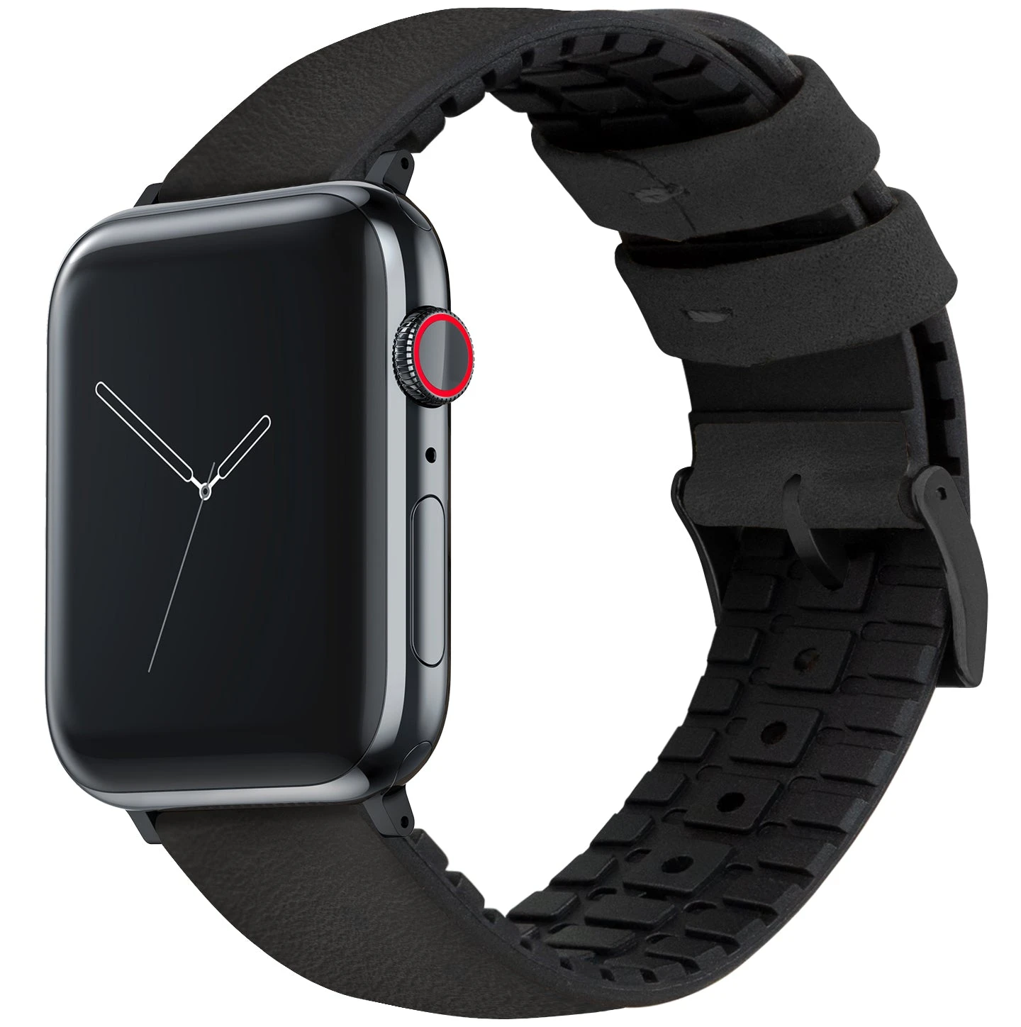 This Black Leather Hybrid Apple Watch Band combines the best of both worlds, offering comfort, style, and flexibility. Featuring a treaded 80D rubber base, 316L stainless steel or black PVD hardware, and top-grain leather, this Apple Watch Band is ready for anything your day might throw your way.