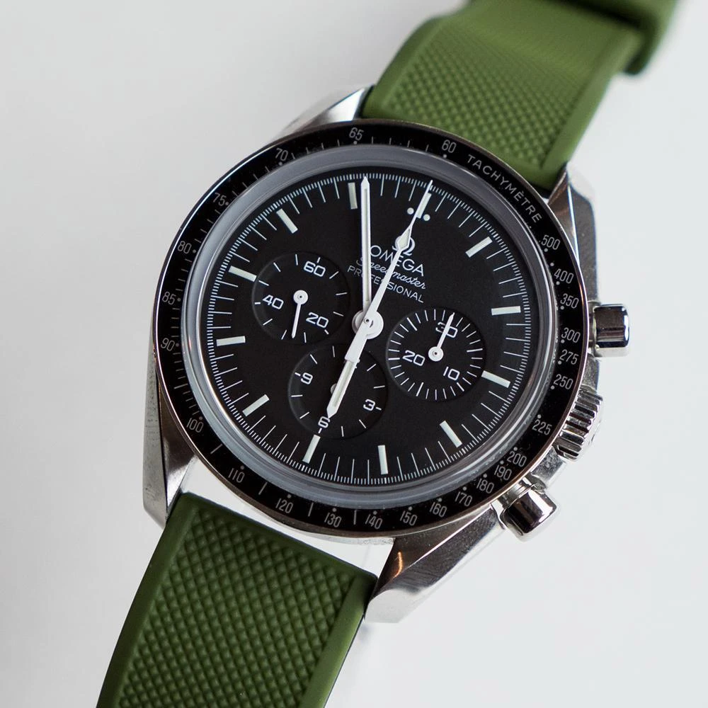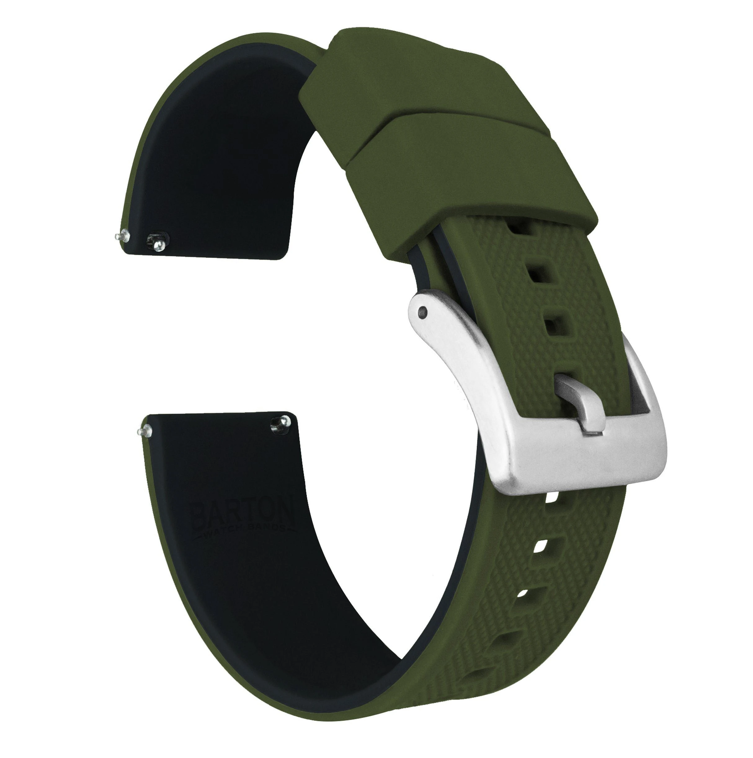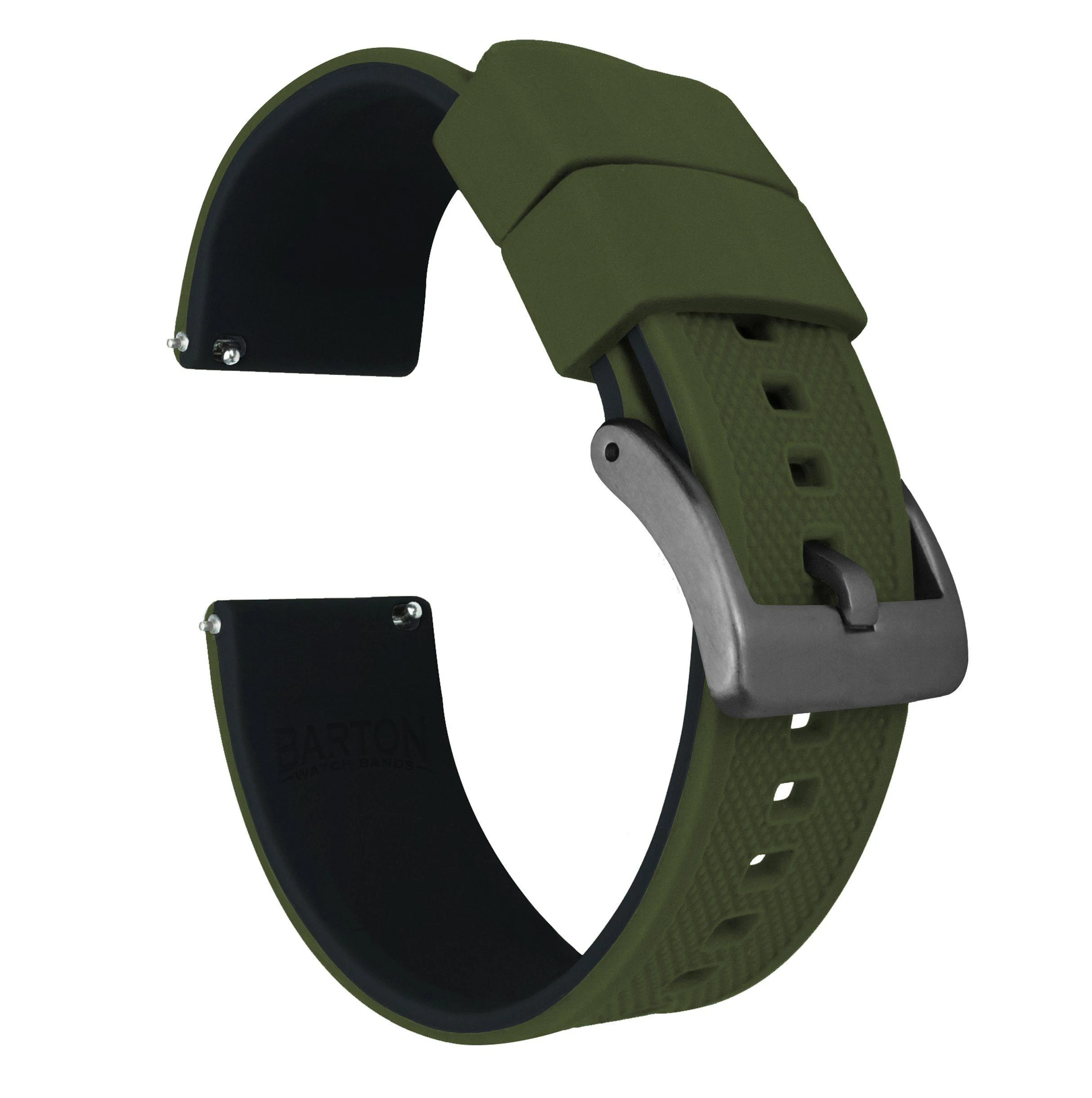 Our Elite Silicone Quick Release army green and black watch bands feature a premium textured top, a 316L surgical grade brushed stainless steel buckle, and a 2mm taper from watch head to buckle. Each army green silicone watch strap also comes standard with two included lengths to assure they will be a perfect fit for almost anyone. Swap out in just a few seconds and without tools! Pair this silicone rubber watch band with our Leather or Canvas quick release bands to take full advantage of the opportunity to ‘Switch it Up’ on the go.