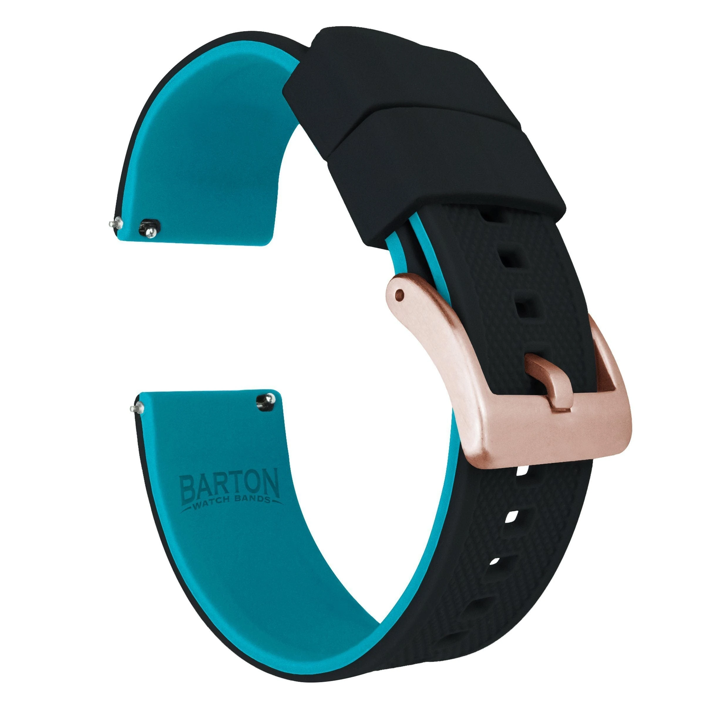 This black and aqua watch band features a premium textured top, a 316L surgical grade brushed stainless steel buckle, and a 2mm taper from watch head to buckle. All Elite Silicone bands also come standard with two included lengths to assure they will be a perfect fit for almost anyone. Swap this quick release silicone watch strap out in just a few seconds and without tools! Pair this silicone rubber watch band with our Leather or Canvas quick release bands to take full advantage of the opportunity to ‘Switch it Up’ on the go.