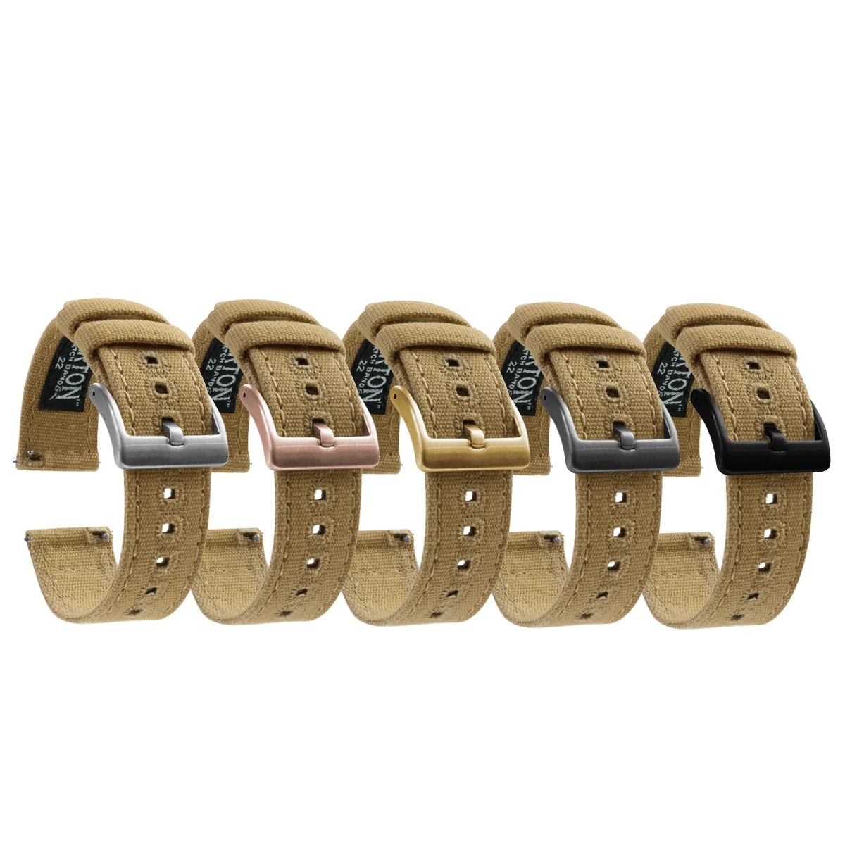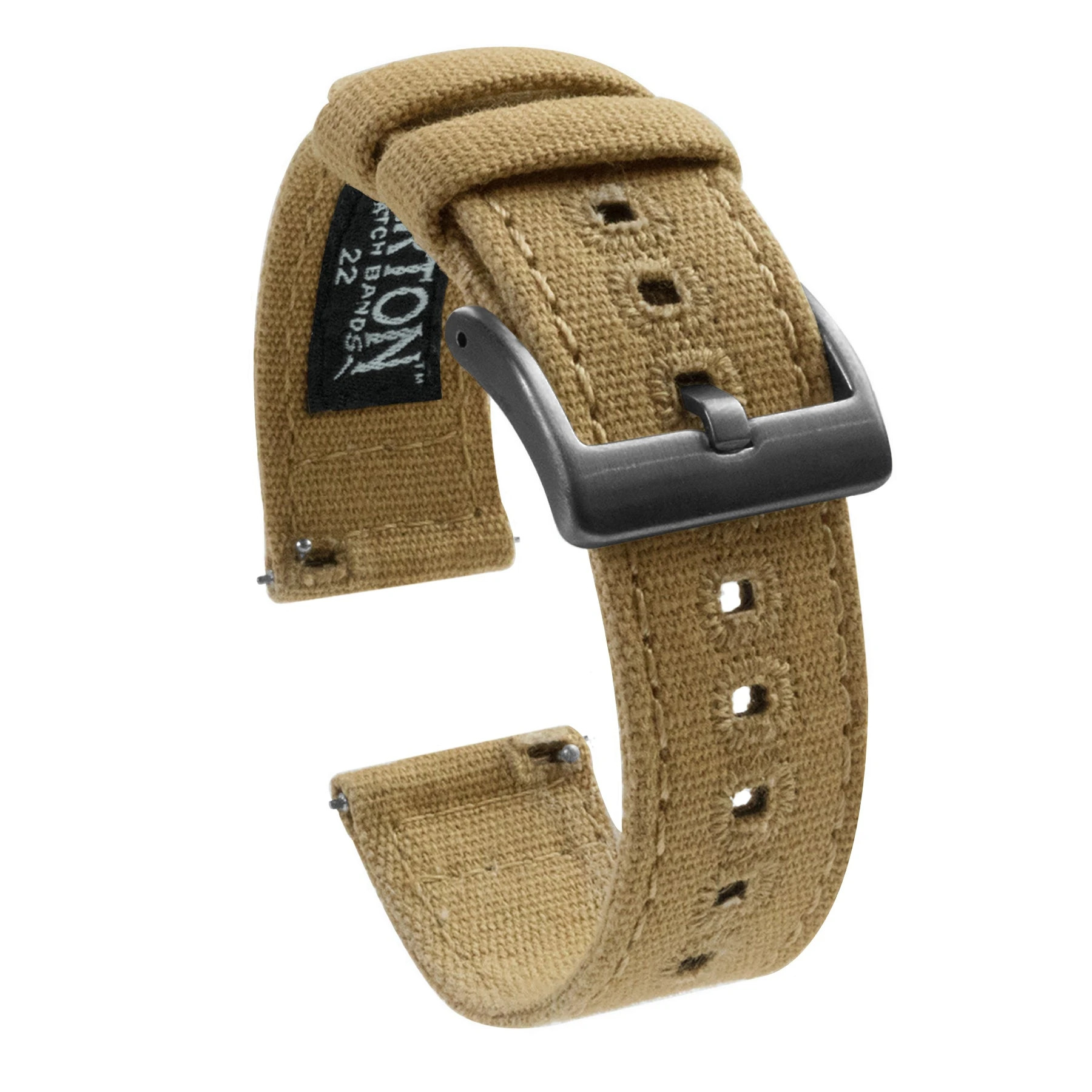 Our Canvas Quick Release watch bands are meticulously crafted from highly durable canvas and embroidered for style and strength. This khaki tan watch strap adds character to any timepiece and can be swapped in and out without any tools! Pair this khaki canvas watch band with our Silicone or Leather Quick Release to take full advantage of the opportunity to ‘Switch it Up’.