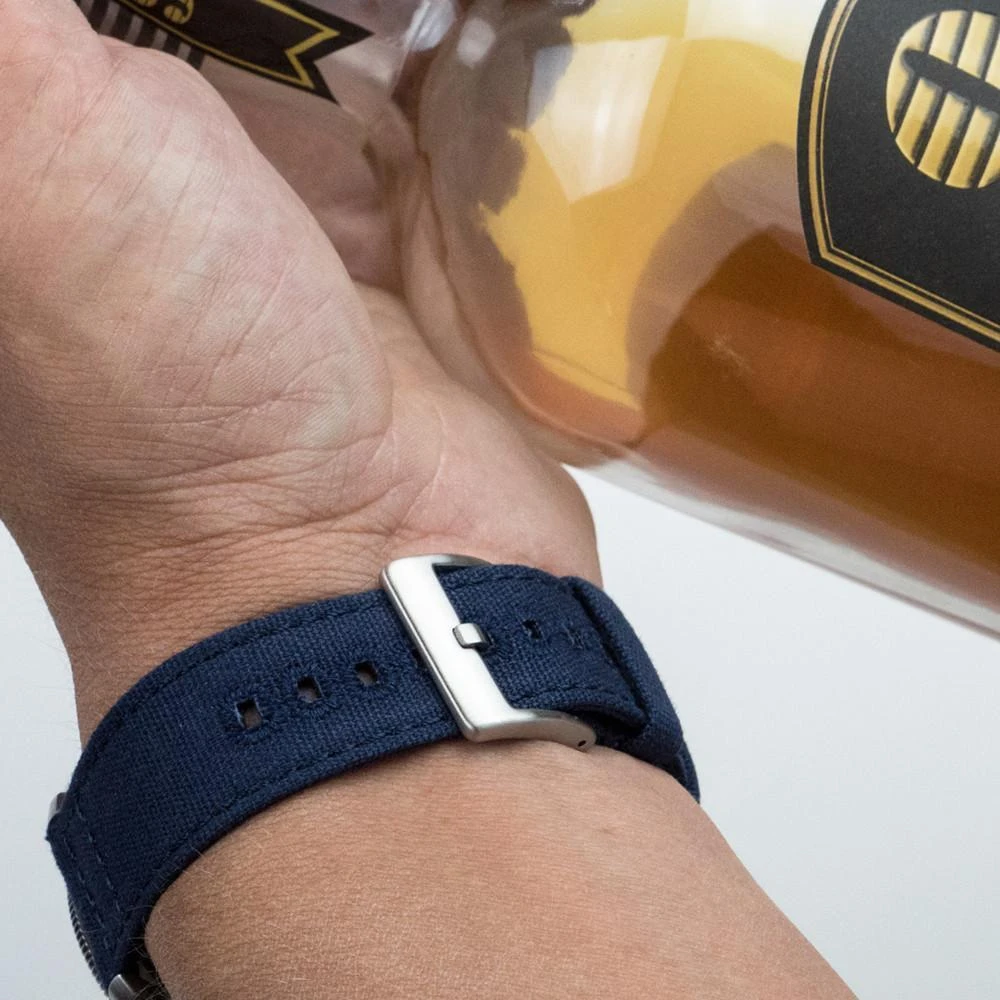 Our Canvas Quick Release watch bands are meticulously crafted from highly durable canvas and embroidered for style and strength. These navy blue canvas watch straps add character to any timepiece and can be swapped in and out without any tools! Pair this navy blue canvas watch band with our Silicone or Leather Quick Release to take full advantage of the opportunity to ‘Switch it Up’.